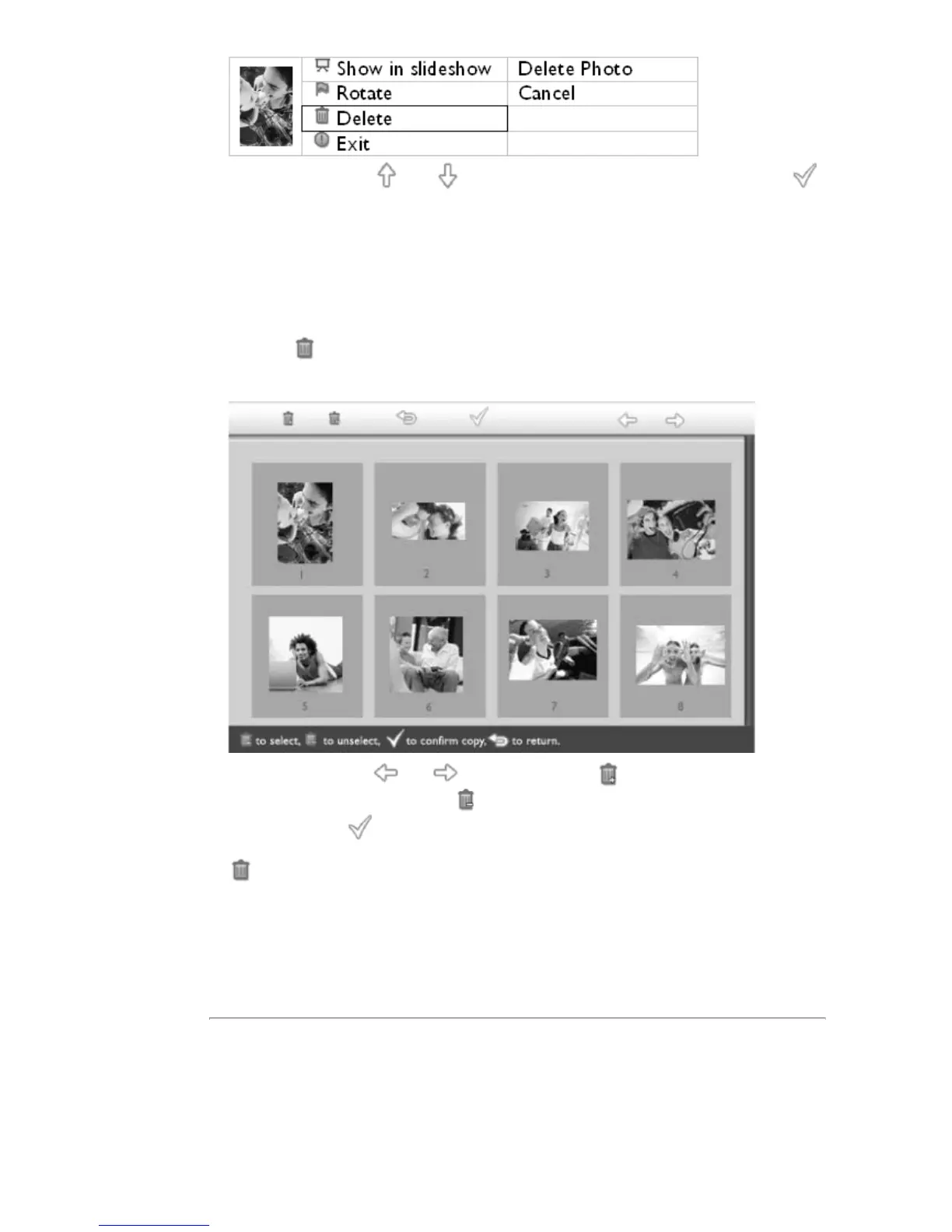 Нажимайте клавишу или для выделения пункта Удалить фото; нажмите