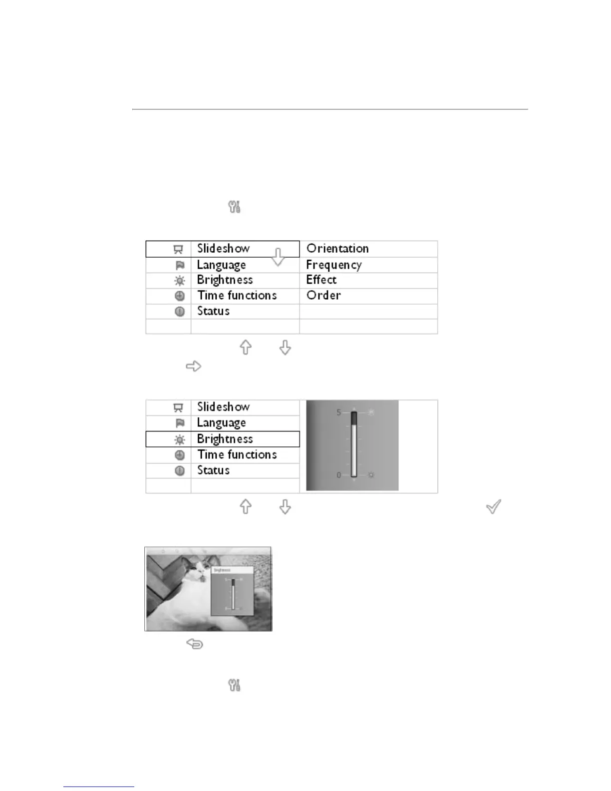 В данном разделе описывается процедура выбора уровня яркости фоторамки и языка