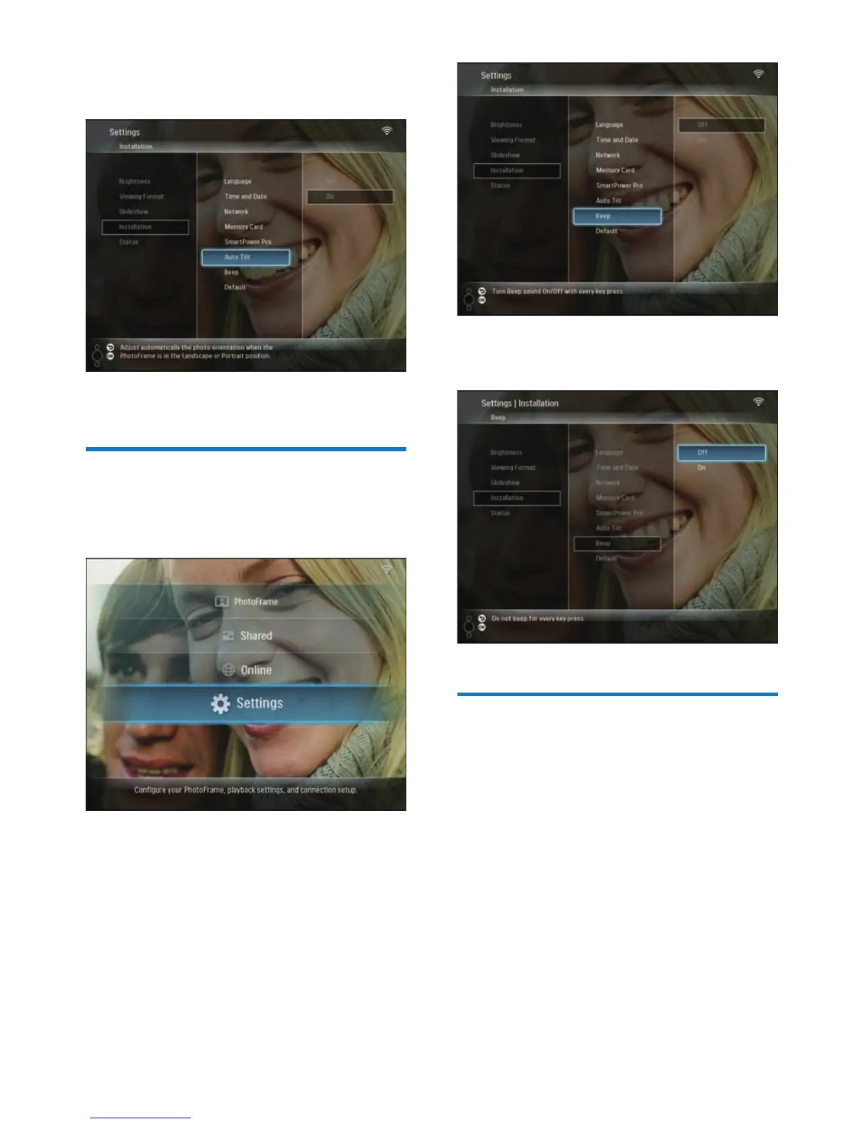 2 Select [Installation] > [Beep], then press