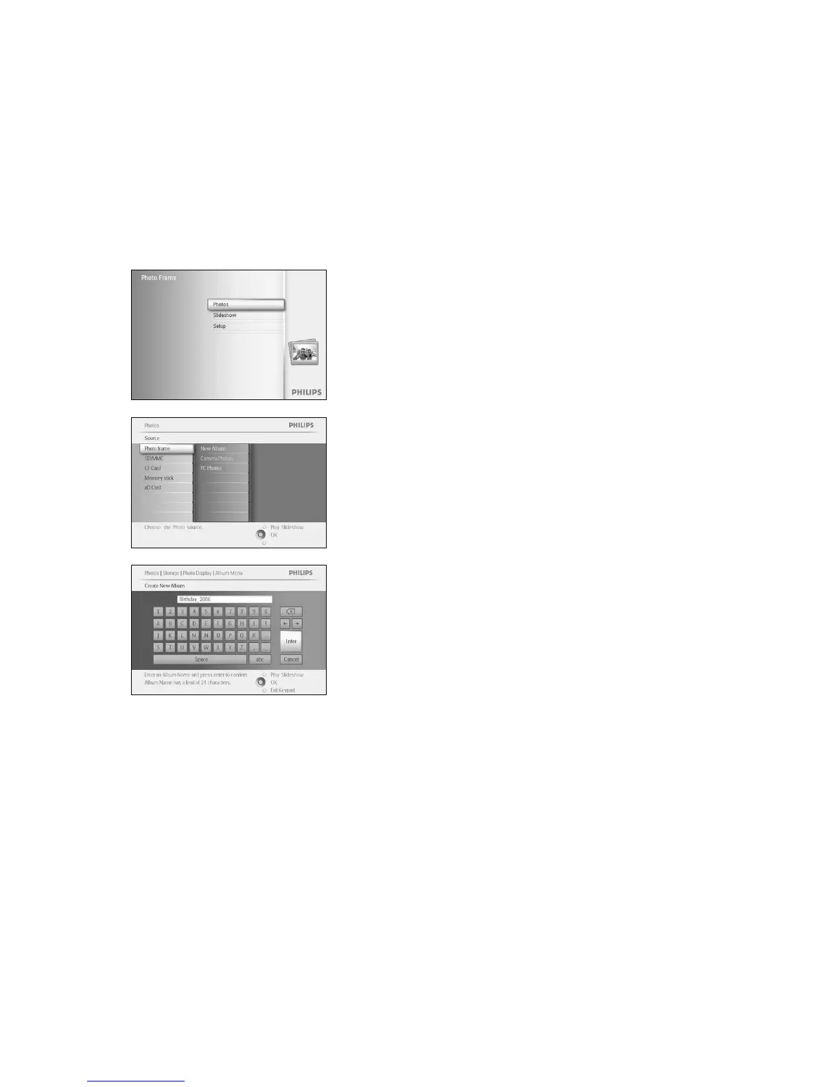 To organize your photos you can create photo albums on your PhotoFrame™ or memory card