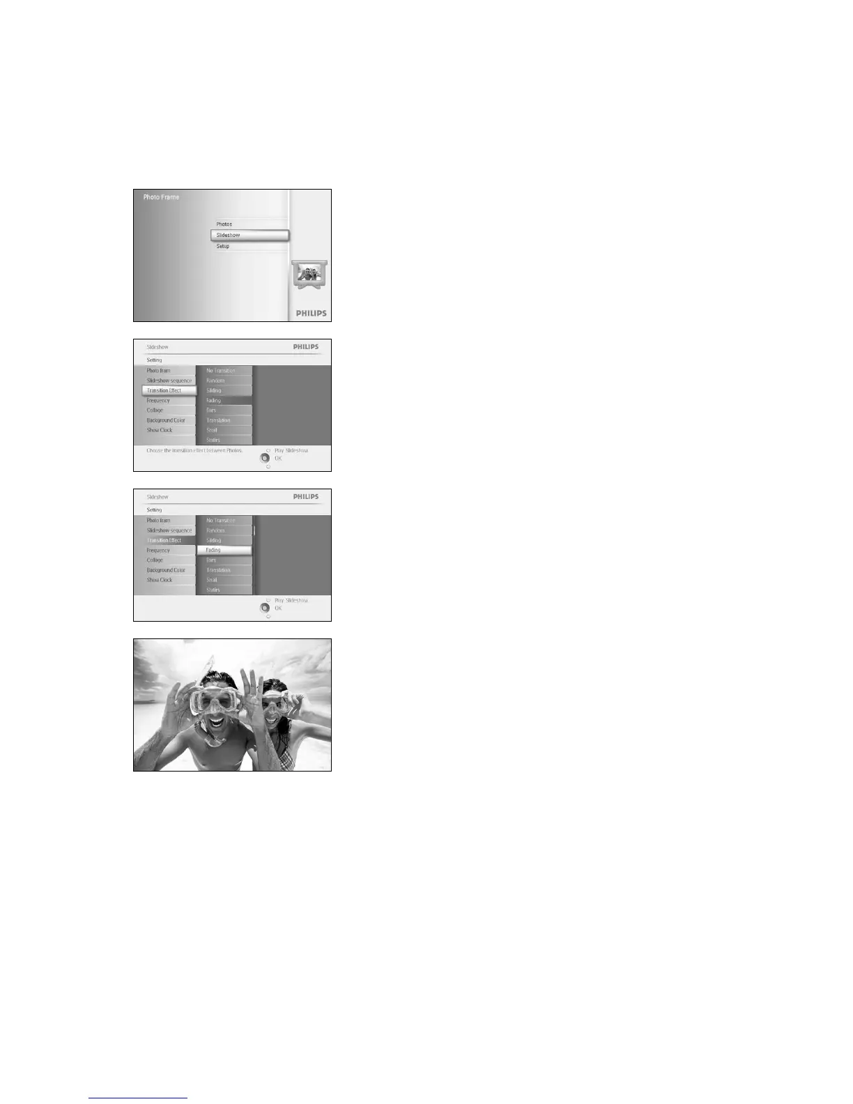 The photos can appear on the screen in one of 3 ways Fade, Slide or Scroll.