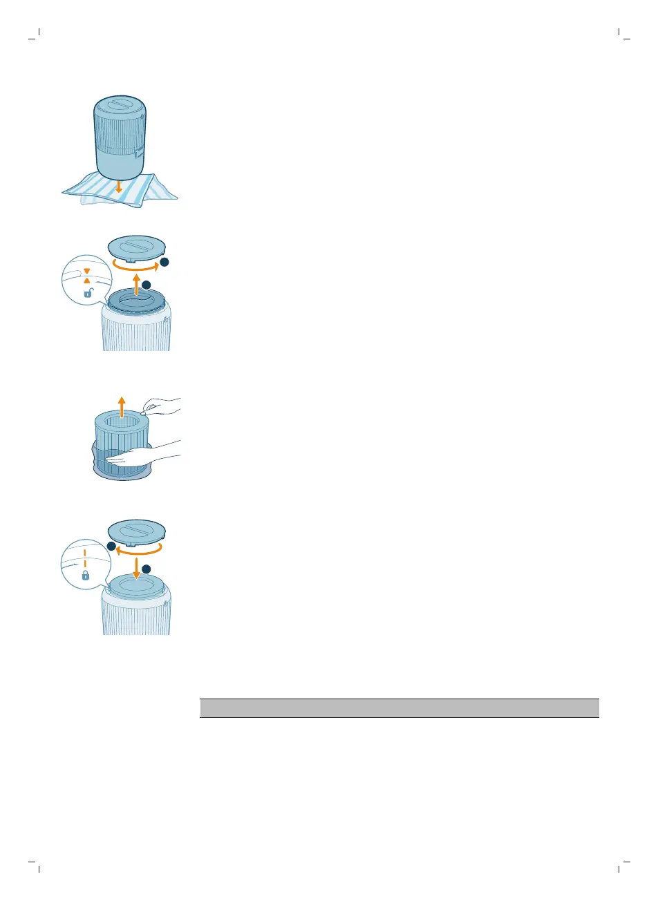 4 將濾網裝回本產品。重新連接機座,並以順時針方向旋轉以扭緊機座。