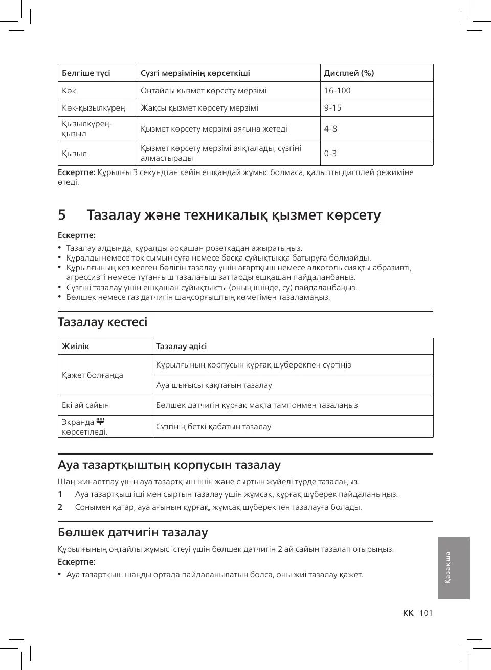 Құрылғының оңтайлы жұмыс істеуі үшін бөлшек датчигін 2 ай сайын тазалап отырыңыз.