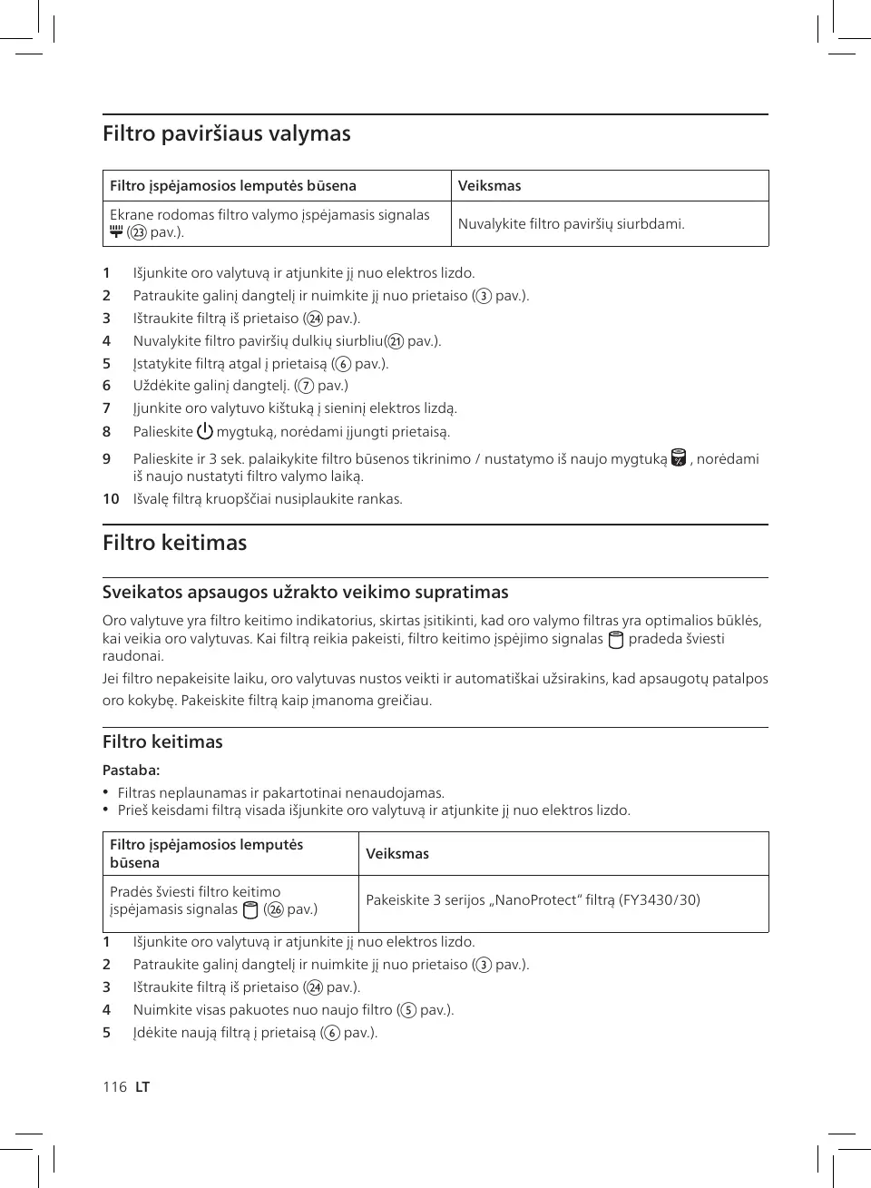 Jei ltro nepakeisite laiku, oro valytuvas nustos veikti ir automatiškai užsirakins, kad apsaugotų patalpos