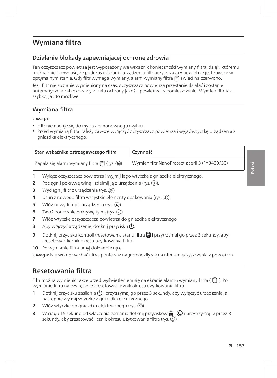 9 Dotknij przycisku kontroli/resetowania stanu ltra i przytrzymaj go przez 3 sekundy, aby