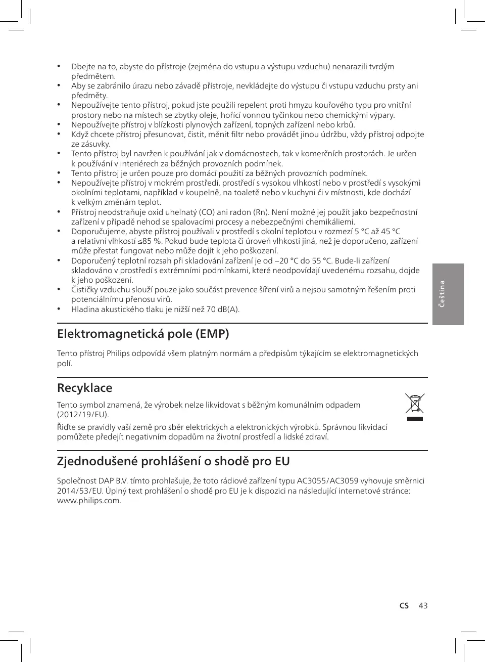 Společnost DAP B.V. tímto prohlašuje, že toto rádiové zařízení typu AC3055/AC3059 vyhovuje směrnici