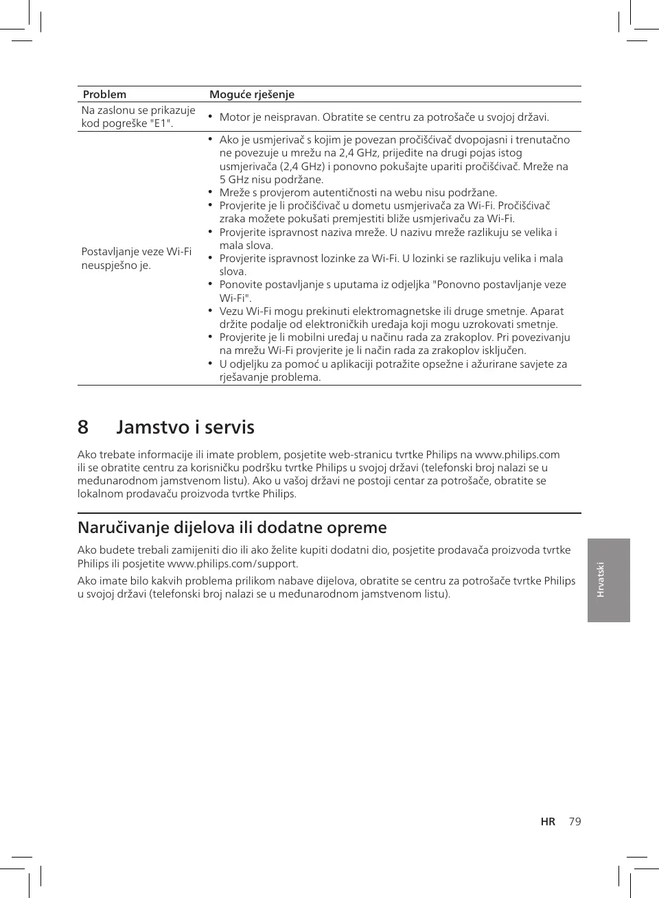 Ako imate bilo kakvih problema prilikom nabave dijelova, obratite se centru za potrošače tvrtke Philips