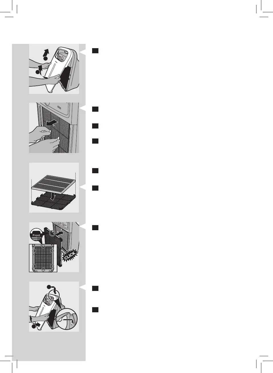 8 Put the pre-lter back into the appliance. Attach all hooks properly to