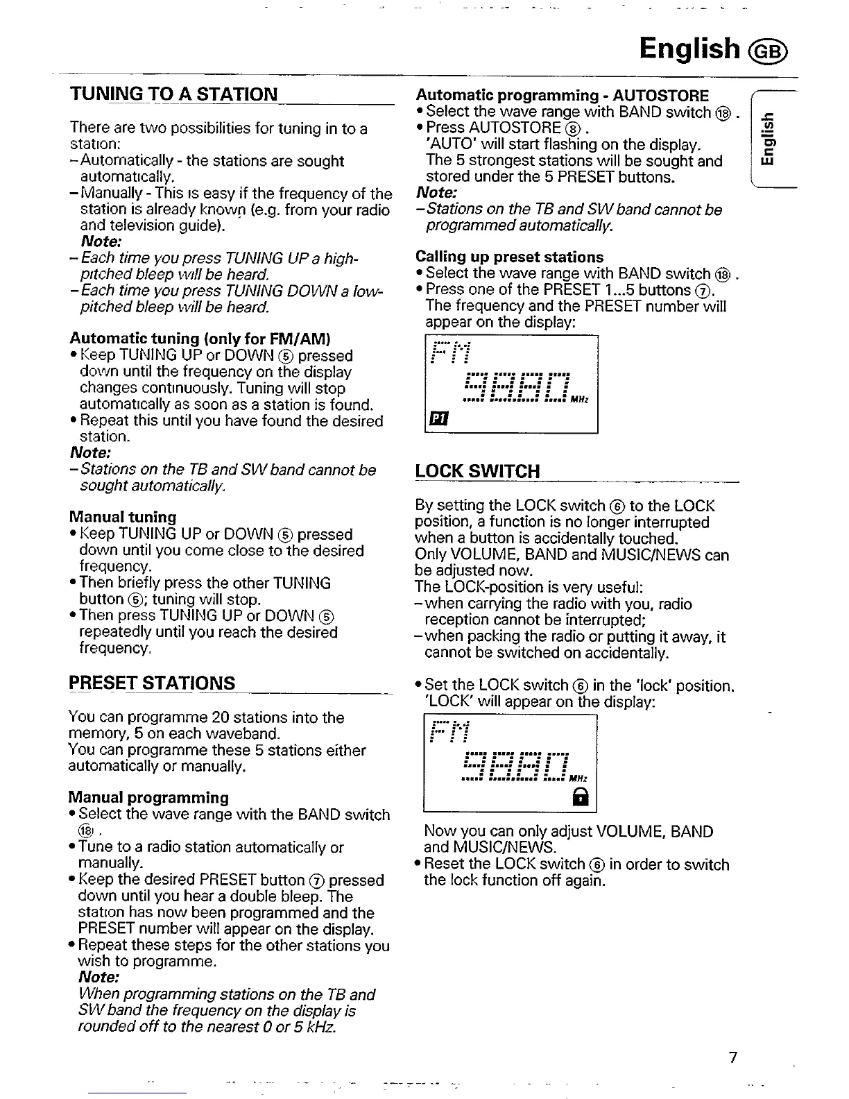 Philips AE 3625 - TUNING AND STATION STORAGE; STATION TUNING METHODS; PROGRAMMING PRESET STATIONS; LOCK SWITCH FUNCTIONALITY