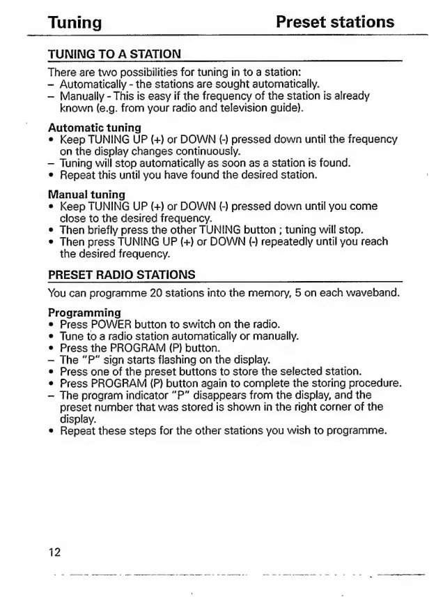 Philips AE 3650 - Tuning to Radio Stations; Automatic Station Tuning; Manual Station Tuning; Preset Station Management