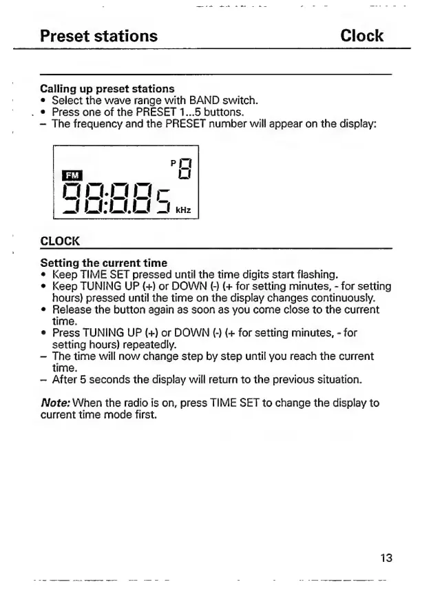 Philips AE 3650 - Recalling Preset Stations; Setting the Clock; Setting the Current Time
