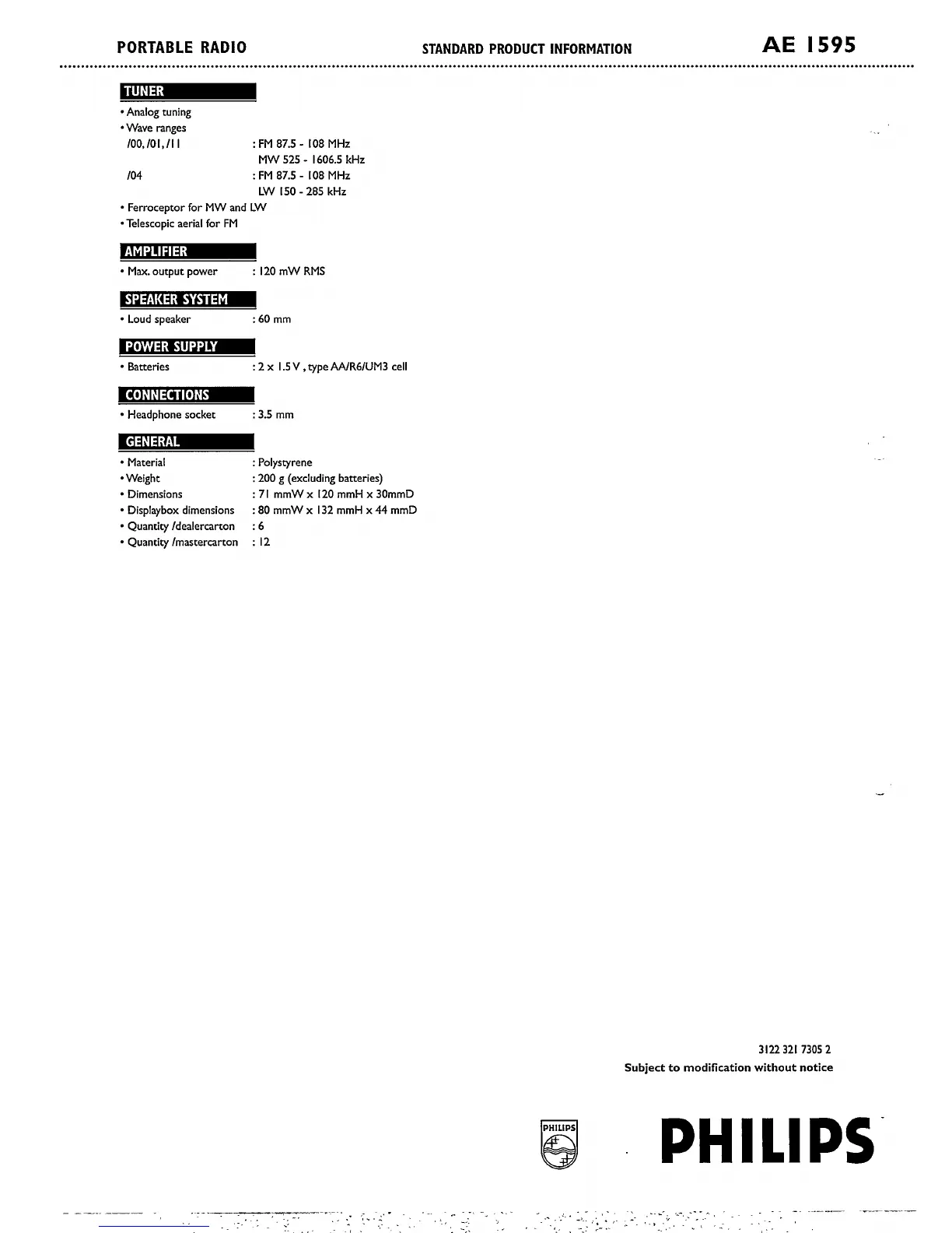 Philips AE1595/00 - Standard Product Information; Tuner Specifications; Amplifier and Speaker System; Power Supply and Connections