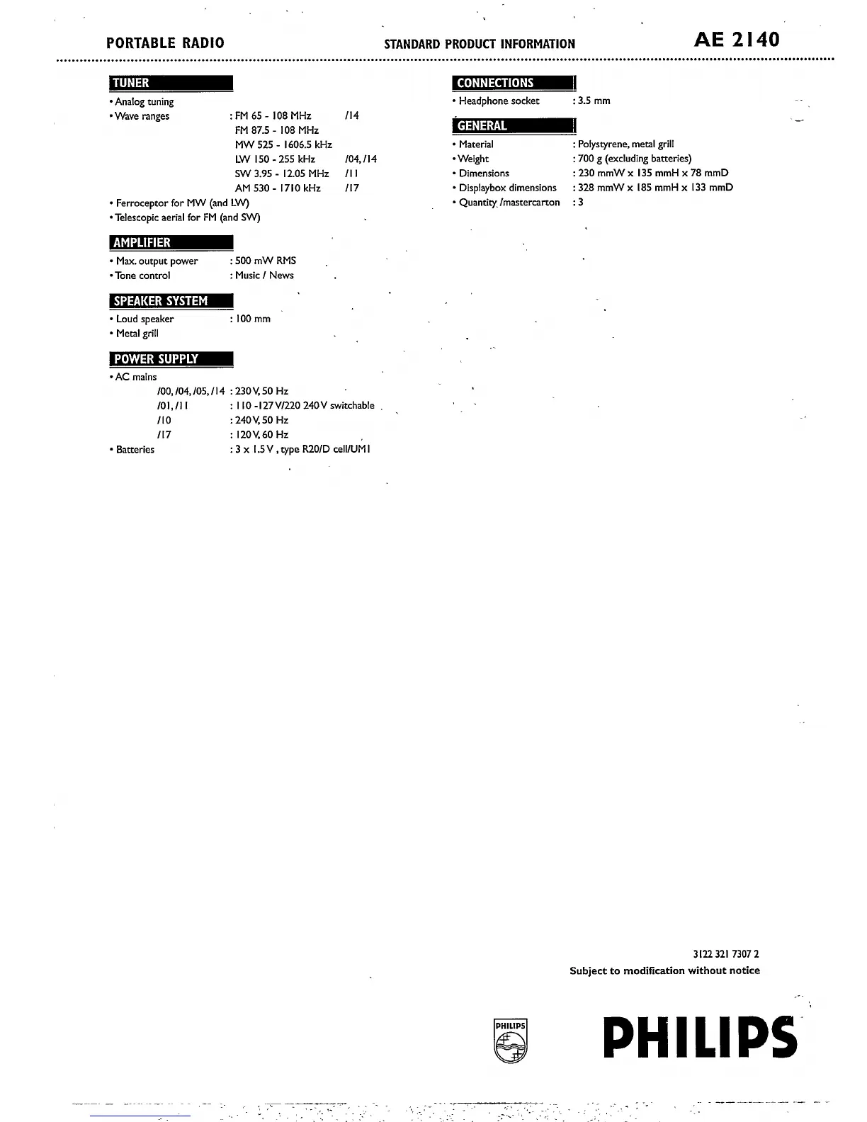 Philips AE2140/05 - Standard Product Information; Tuner and Wave Range Details; Connections and Audio Output; Amplifier and Speaker System