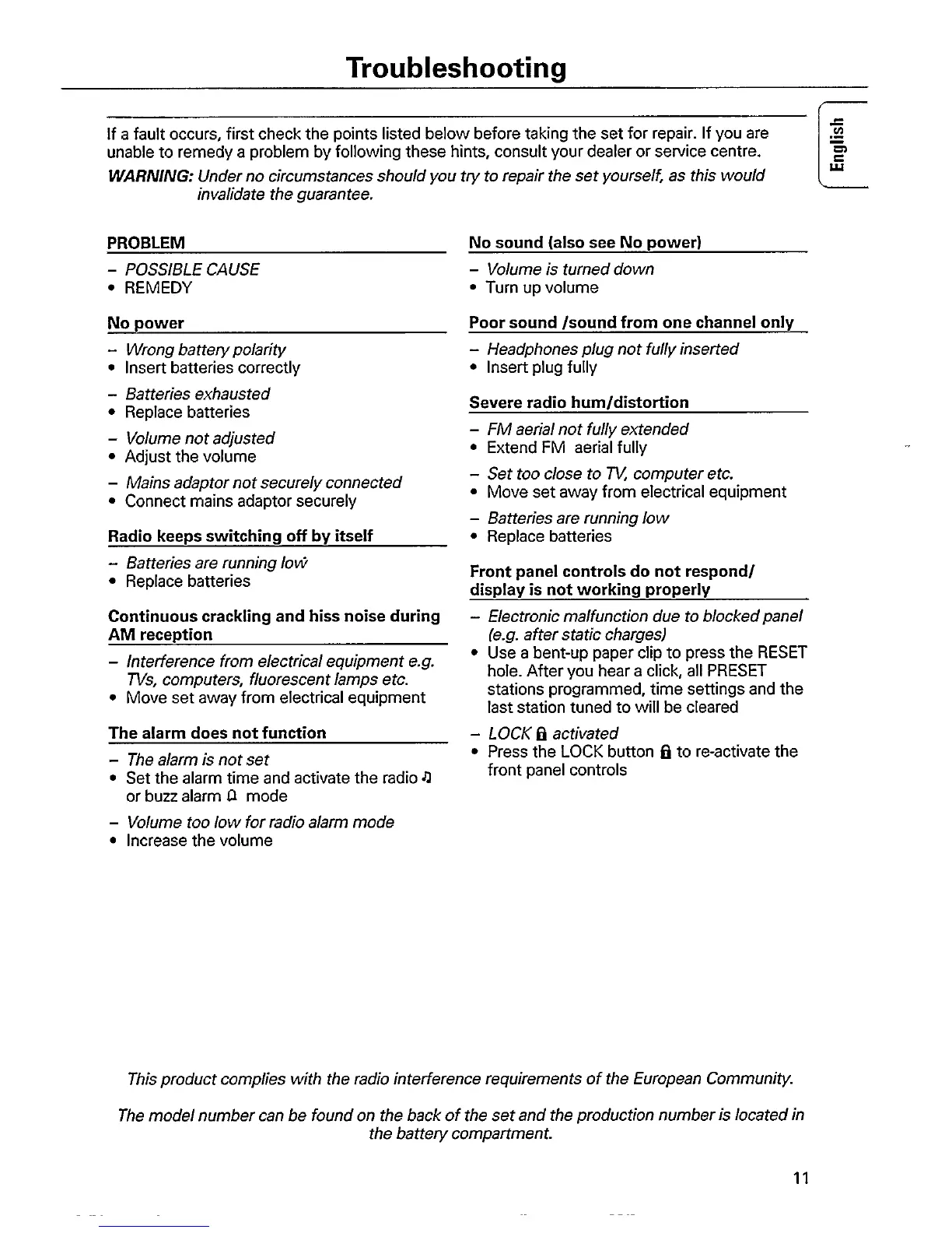 Philips AE3750/00 - Troubleshooting; Power and Sound Issues; Reception and Control Problems