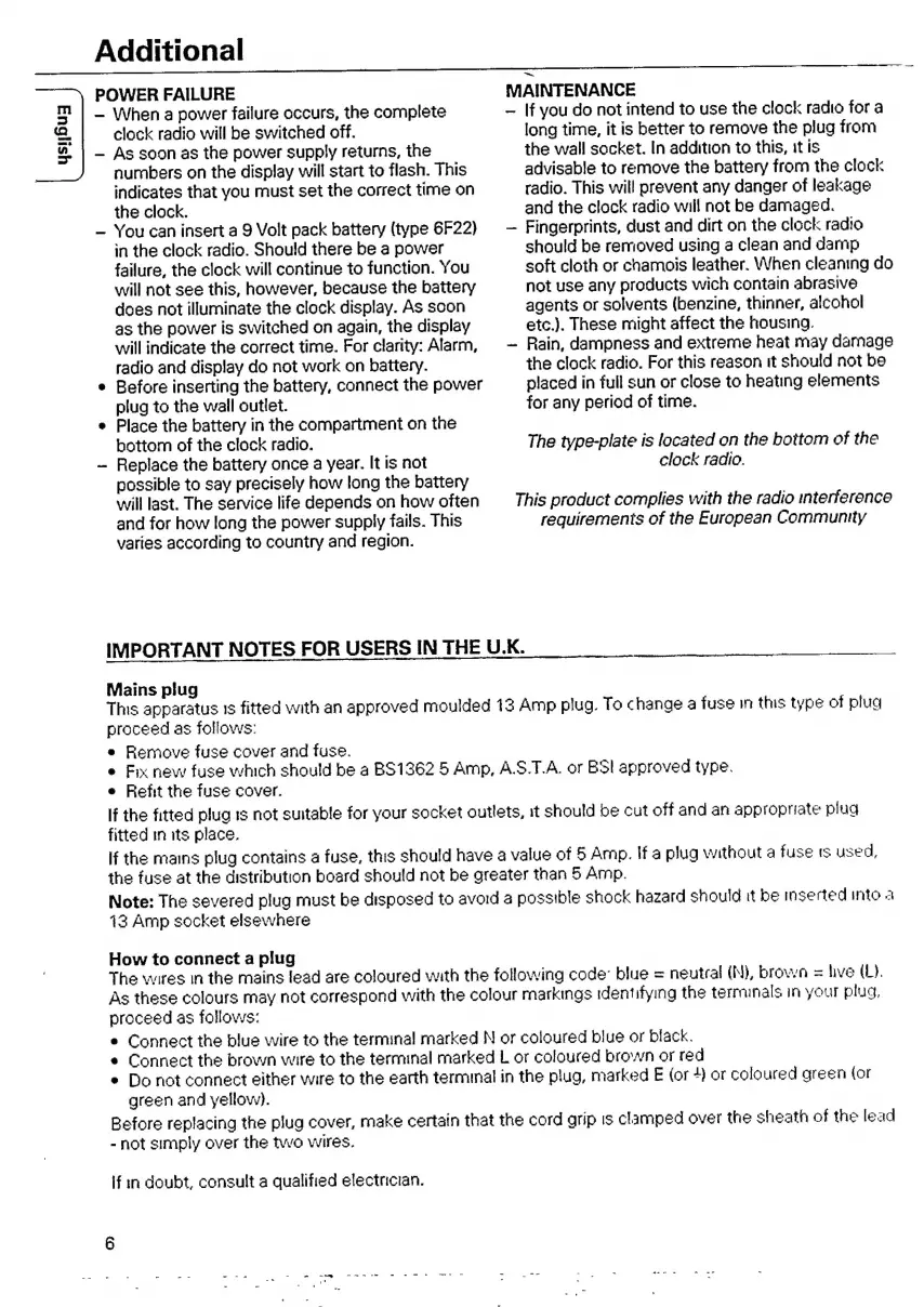 Philips AJ 3040 - Philips AJ3040 Clock Radio Power Failure and Battery Backup; Philips AJ3040 Clock Radio Maintenance and Care; Philips AJ3040 Clock Radio UK Specific Notes