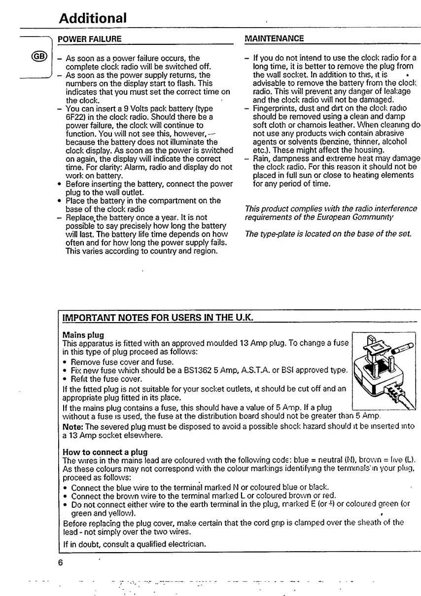 Philips AJ 3150 - Power Failure and Maintenance; Power Failure Handling; Maintenance and Cleaning; Important UK User Notes