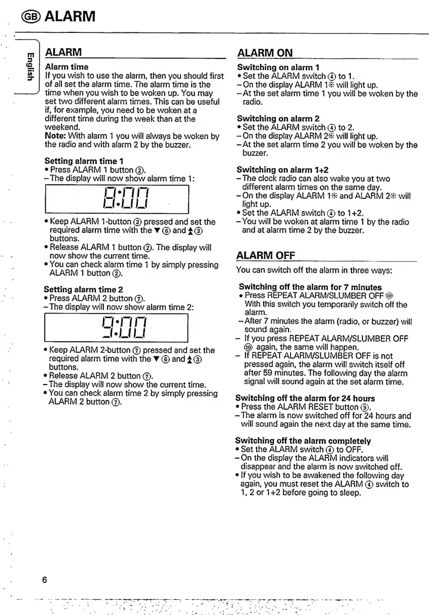 Philips AJ 3630 - Alarm Functions; Setting Alarm Times; Activating Alarms; Disabling Alarms
