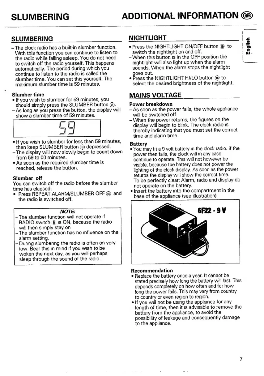 Philips AJ 3630 - Slumbering and Nightlight; Using the Slumber Function; Nightlight Operation; Power and Battery Information