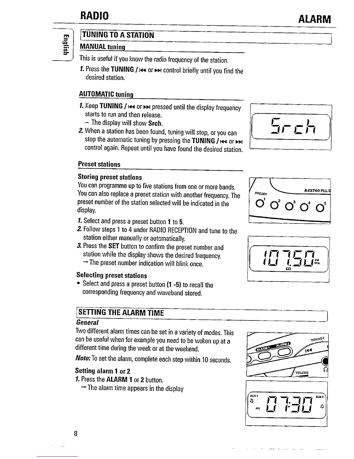 Philips AJ 3740 - Tuning to a Station; Setting the Alarm Time; Manual;Automatic Tuning; Storing Preset Stations