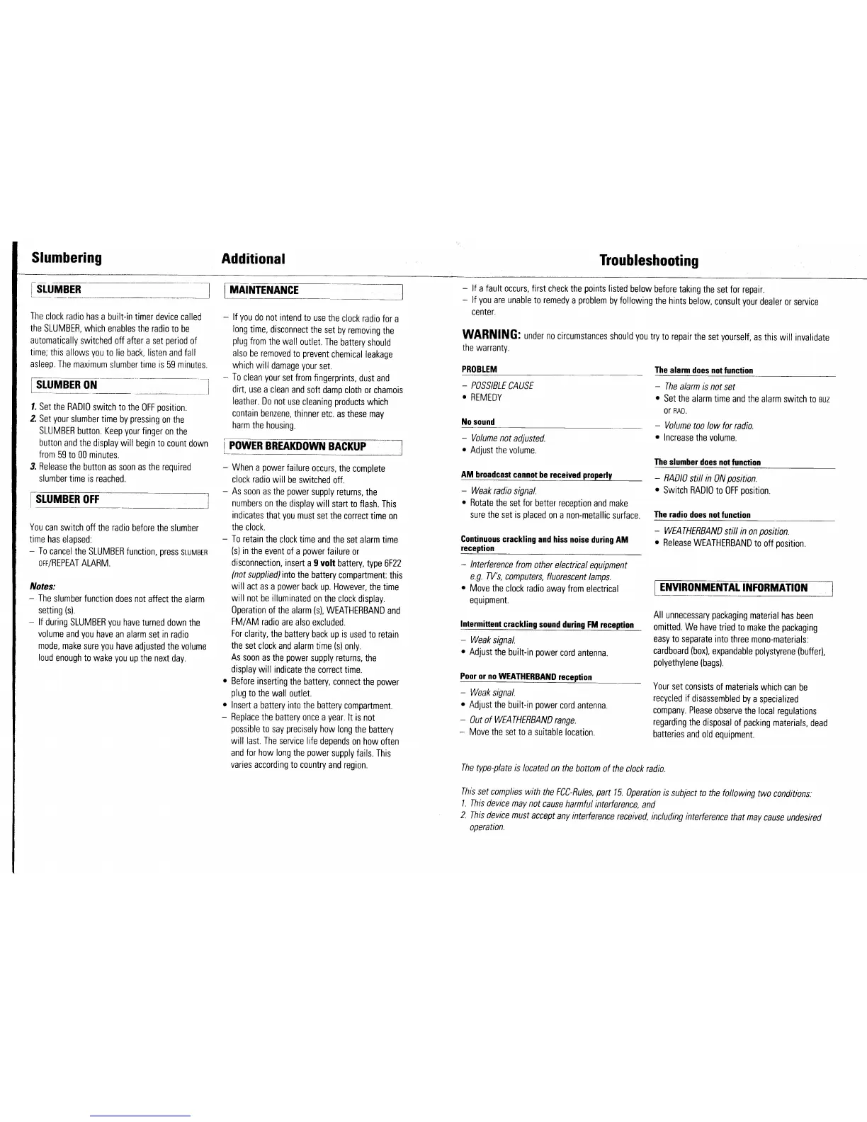 Philips AJ3480 - Additional Features and Troubleshooting; Slumber Function; Maintenance; Power Breakdown Backup