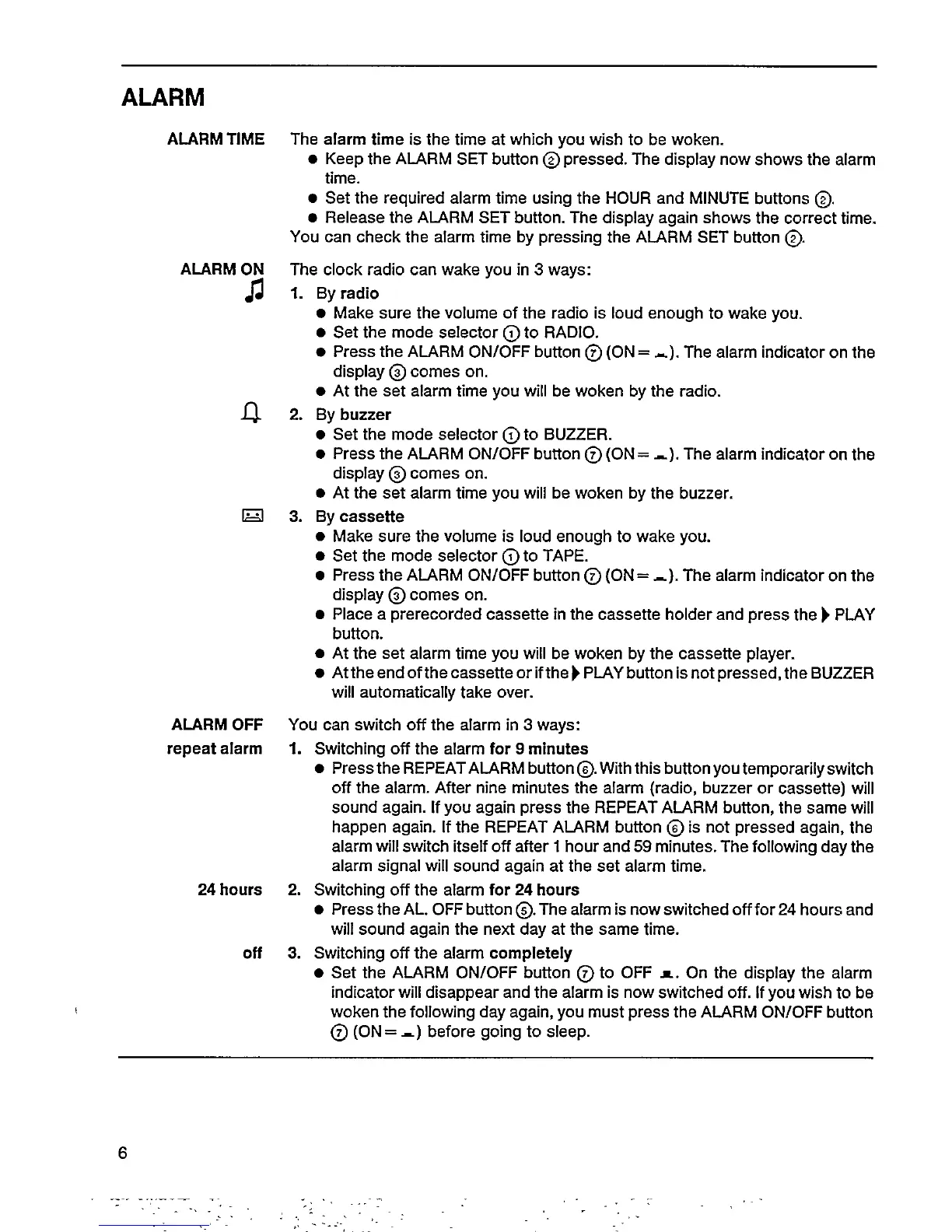 Philips AJ3800 - Alarm Setup and Management; Setting the Alarm Time; Alarm Activation Modes; Alarm Deactivation Methods