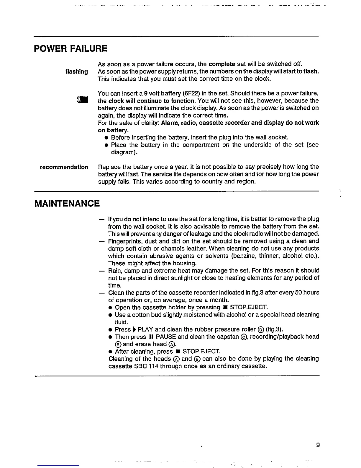 Philips AJ3800 - Power Failure Handling; Power Failure Indication and Battery; Maintenance and Care; Cassette Head and Roller Cleaning