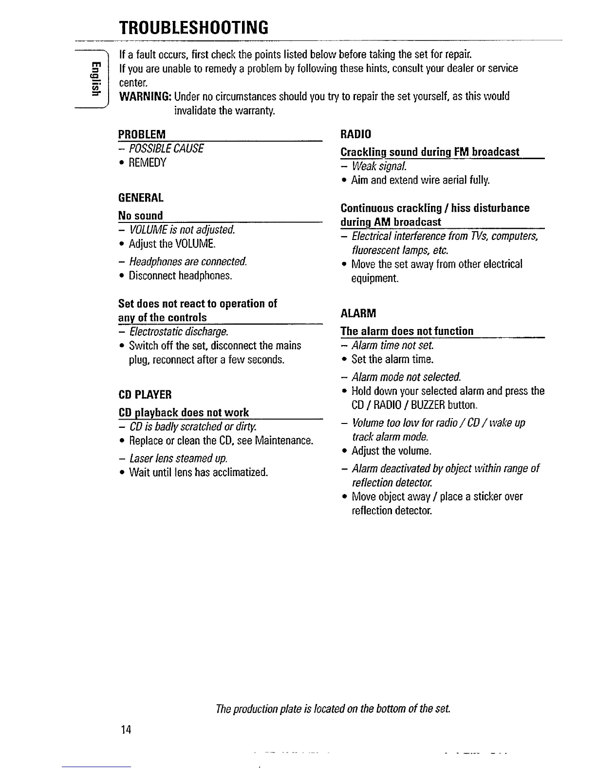 Philips AJ3925 - Troubleshooting Common Issues; Audio Troubleshooting; Alarm and CD Player Issues