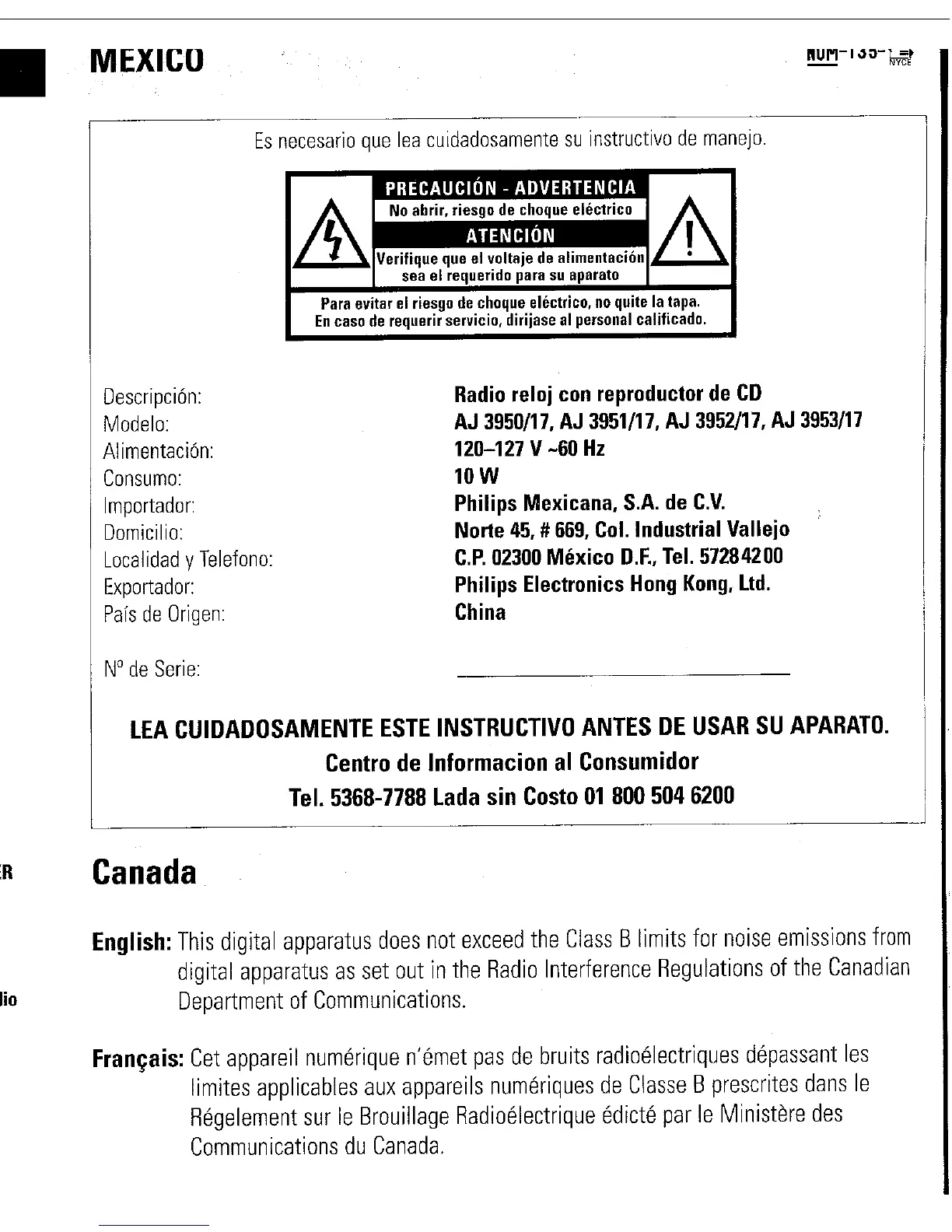 Philips AJ3953 - Product Specifications; Technical Specifications; Regional Regulatory Information; Safety Warnings (Mexico)