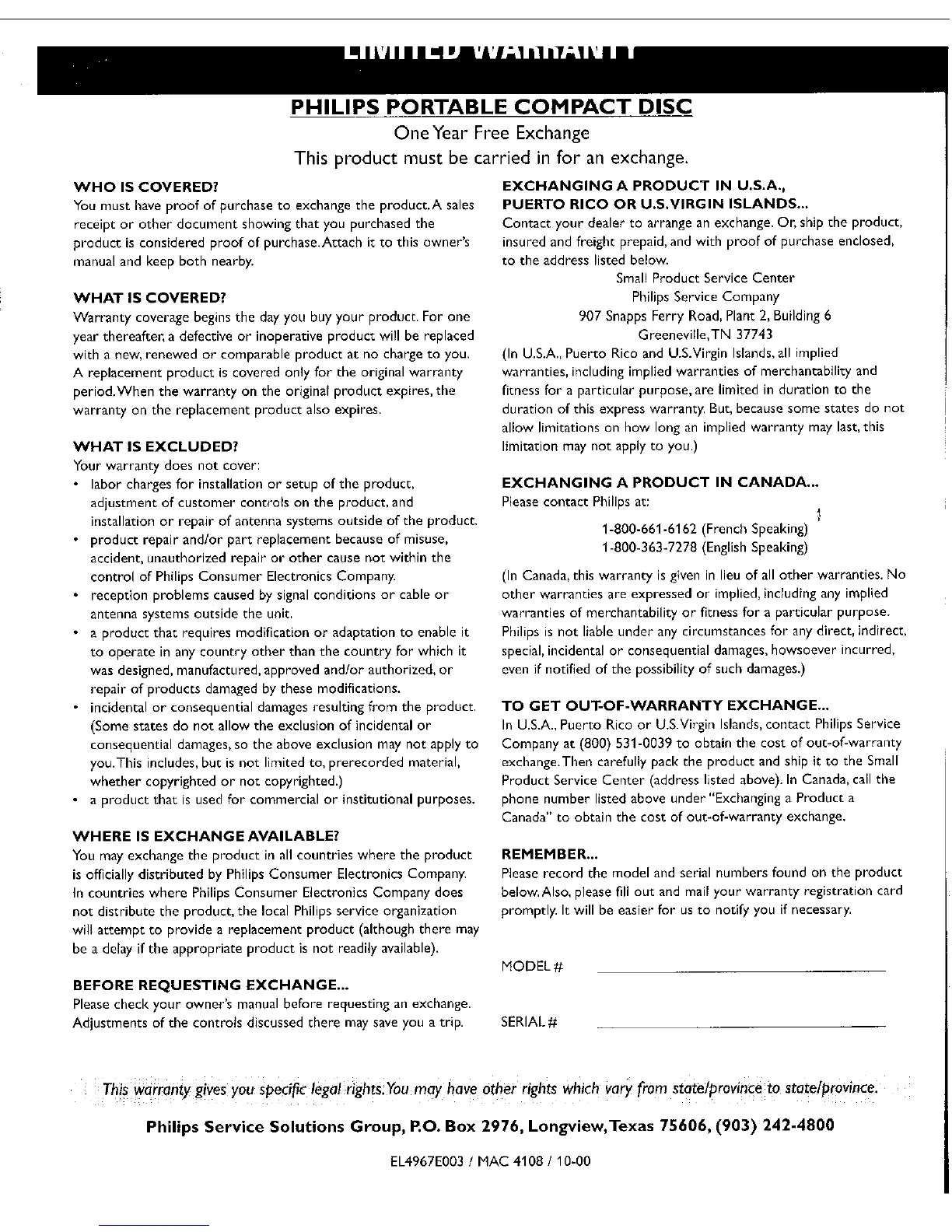 Philips AJ3953 - Limited Warranty and Exchange Policy; Warranty Coverage Details; Product Exchange Procedures; Warranty Registration Reminder