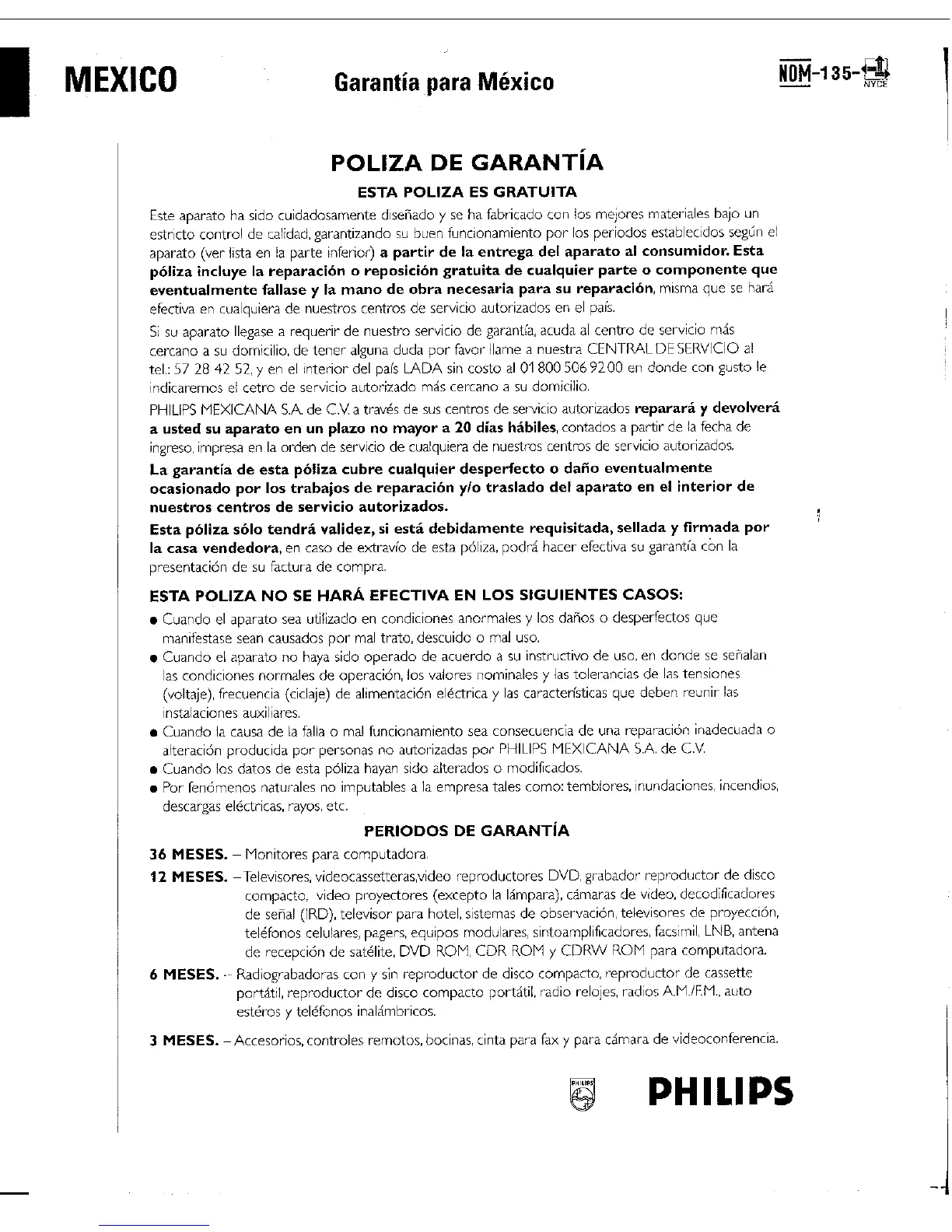 Philips AJ3953 - Mexico Warranty Policy; Warranty Coverage and Service; Warranty Exclusions; Warranty Periods
