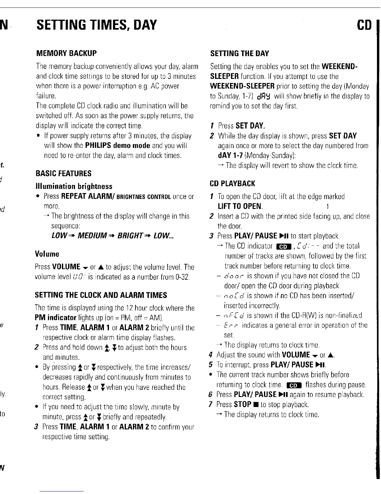 Philips AJ3953 - Basic Features and Time Settings; Memory Backup; Display Brightness and Volume; Setting Clock, Alarm, and Day