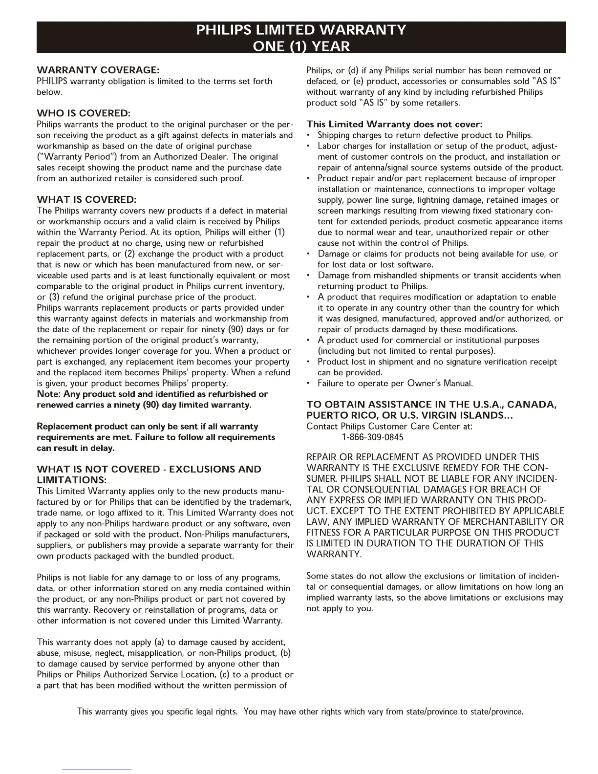Philips AJ7260D - Philips Limited Warranty; Warranty Coverage Details; Warranty Exclusions and Limitations; Obtaining Warranty Assistance