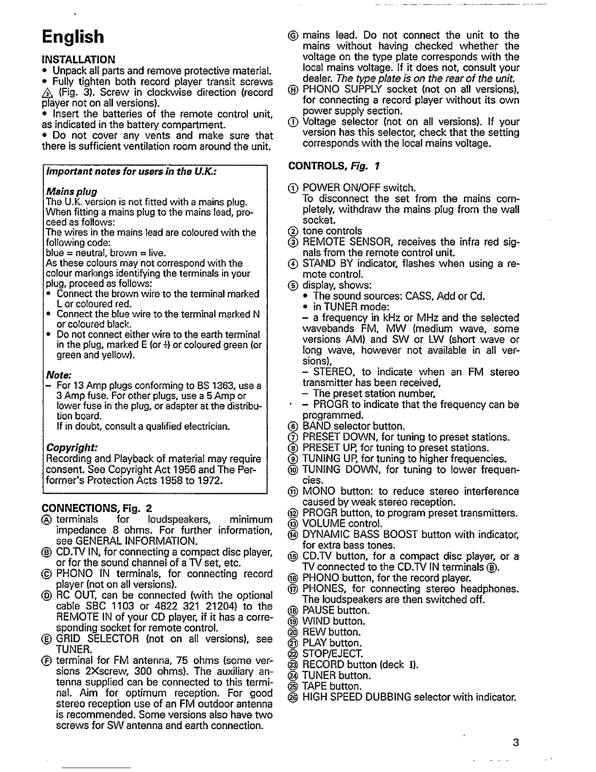 Philips AS 401 - Installation; Controls; Connections; Mains Plug