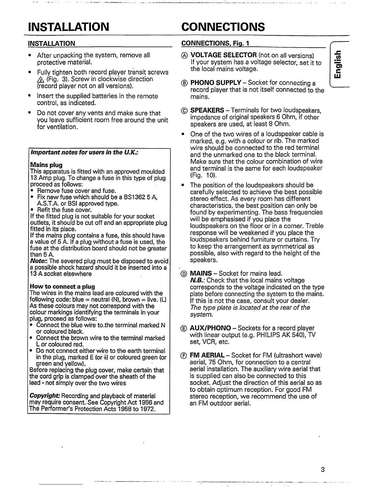 Philips AS 540 - Installation and Connections; System Installation; Voltage Selector; Speaker Connections