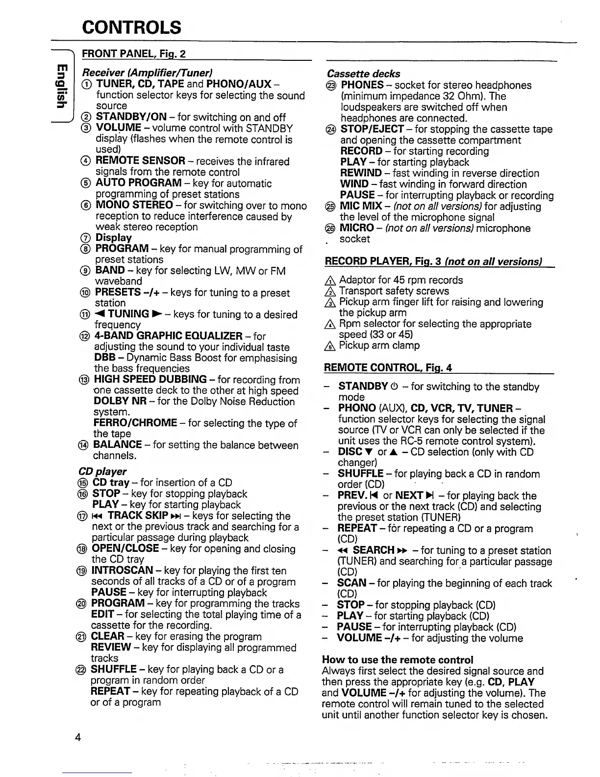 Philips AS 545 - System Controls Overview; Front Panel Controls Overview; Cassette Deck Controls; Record Player Controls