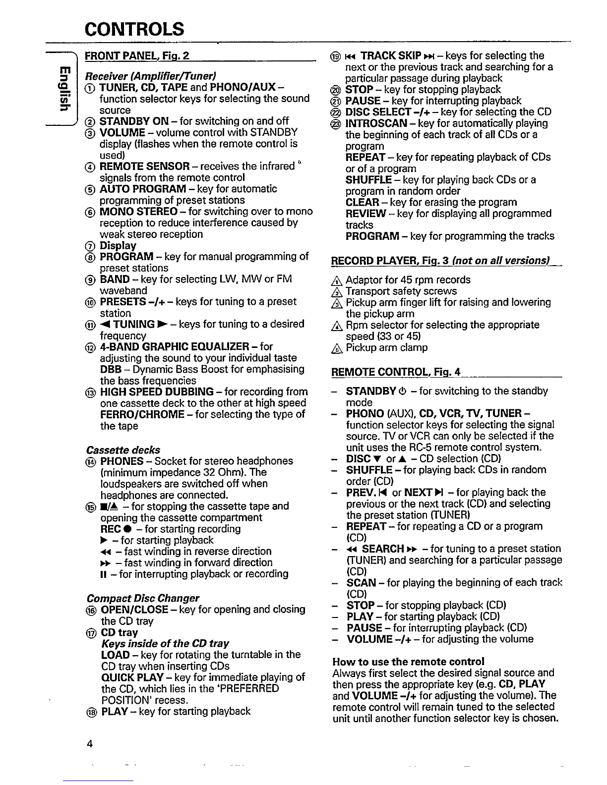 Philips AS 655 - System Controls Overview; Front Panel Controls; Record Player Controls; Remote Control Functions