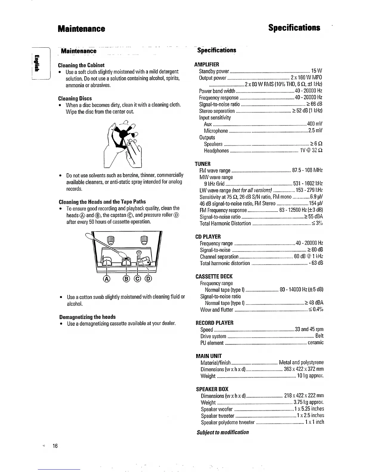 Philips AS 765C - Maintenance; Specifications; Cleaning the Cabinet; Cleaning Discs