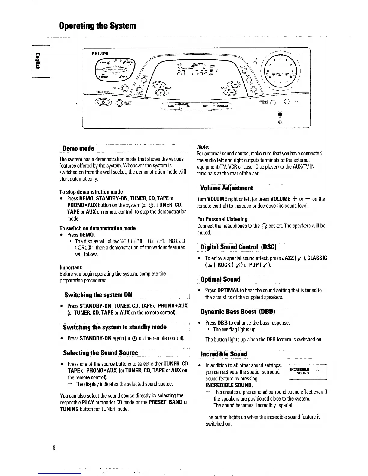 Philips AS 765C - Operating the System; Demo Mode; Volume Adjustment; Switching the System on