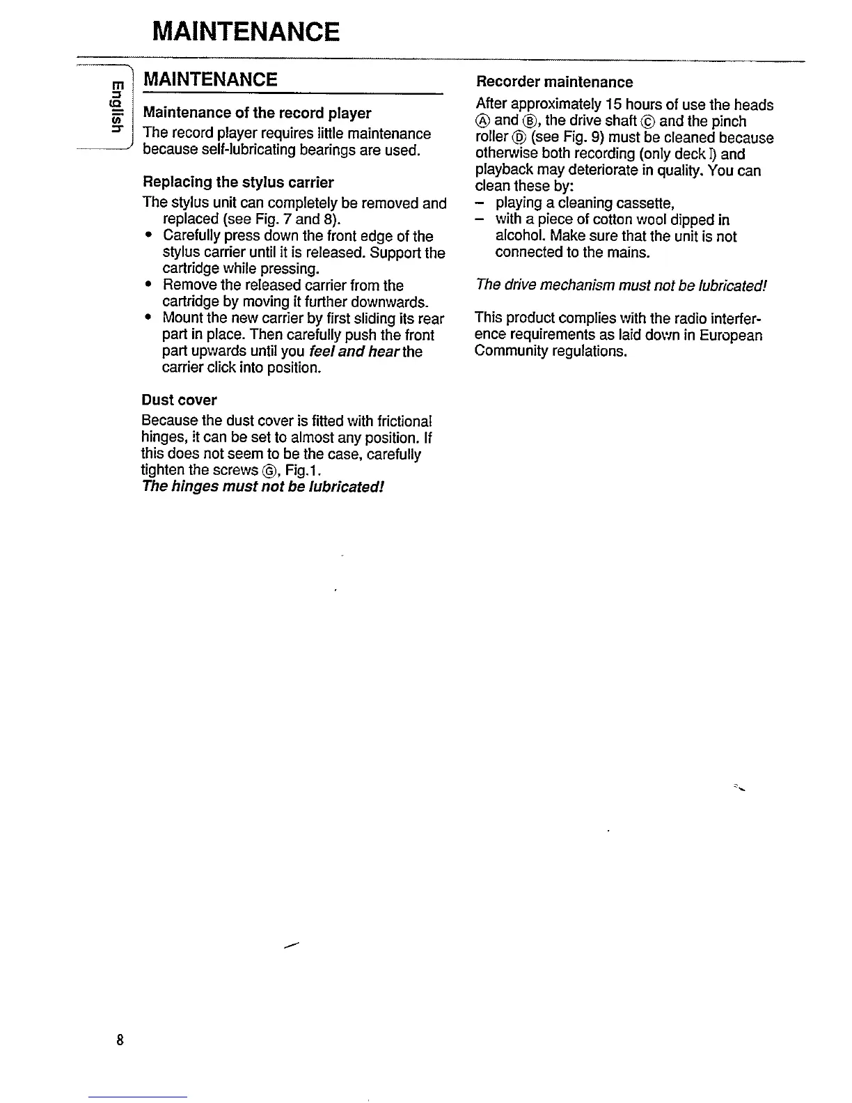 Philips AS135 - Maintenance; Maintenance of the Record Player; Replacing the Stylus Carrier; Dust Cover