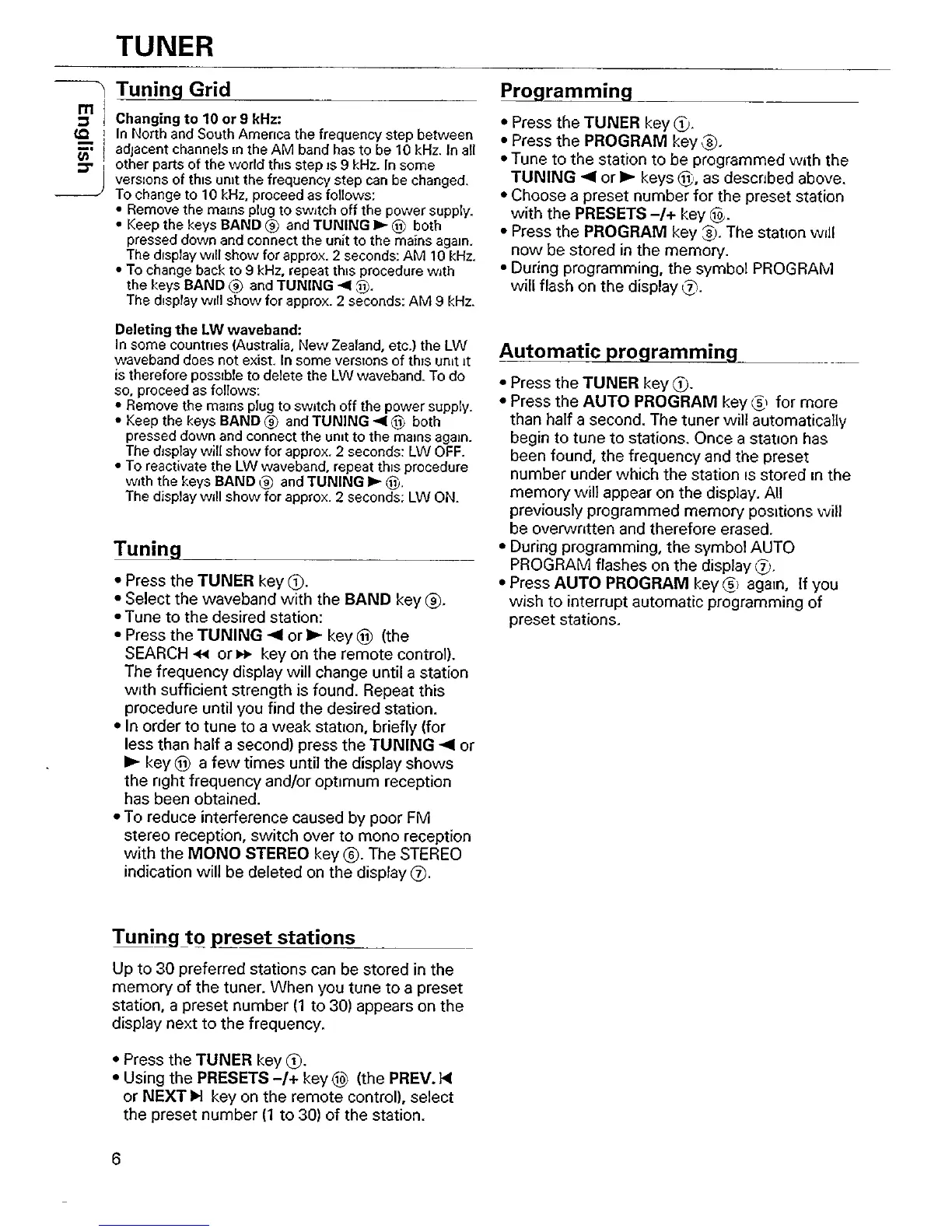 Philips AS455 - TUNER FEATURES AND OPERATION; Tuning Grid Configuration; Manual Station Tuning; Preset Station Management