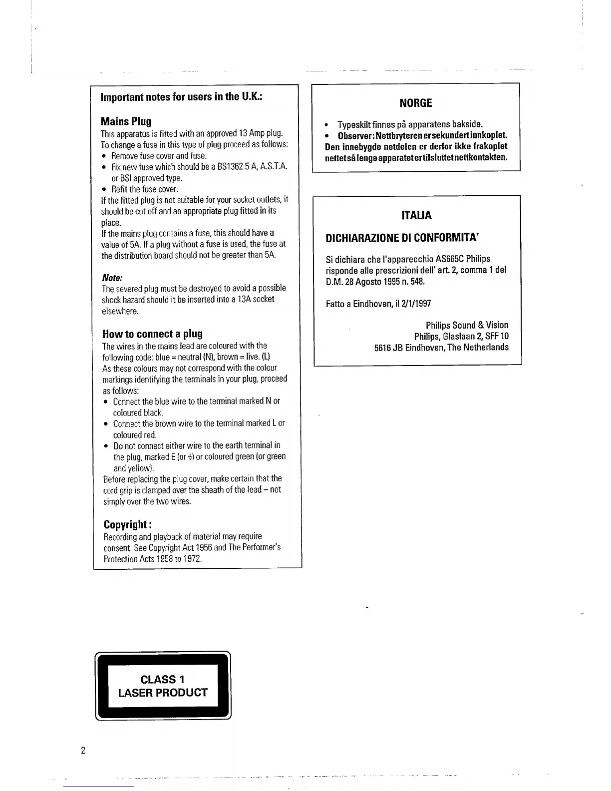Philips AS665C/22 - Important Notes for UK Users; Mains Plug; Connecting the Mains Plug