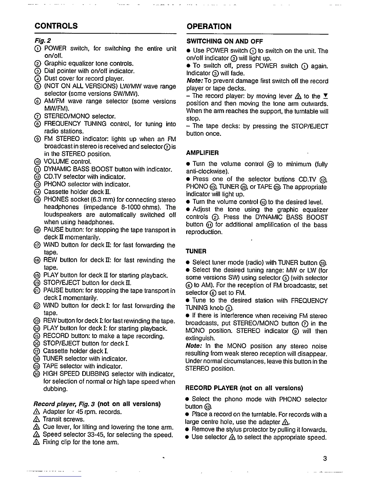 Philips AS9300 - Controls and Operation; Main Unit and Cassette Deck Controls; Record Player Components and Operation; Basic Operation Modes