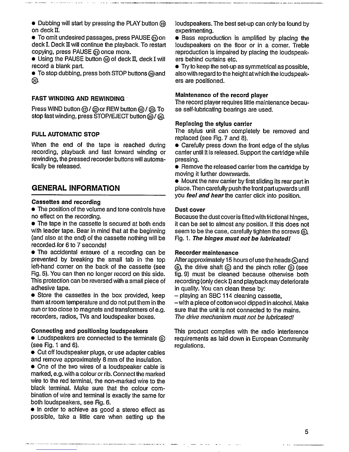 Philips AS9300 - General Information and Maintenance; Tape Operations and Auto Stop; Cassette Handling and Recording Tips; Loudspeaker Connection and Placement