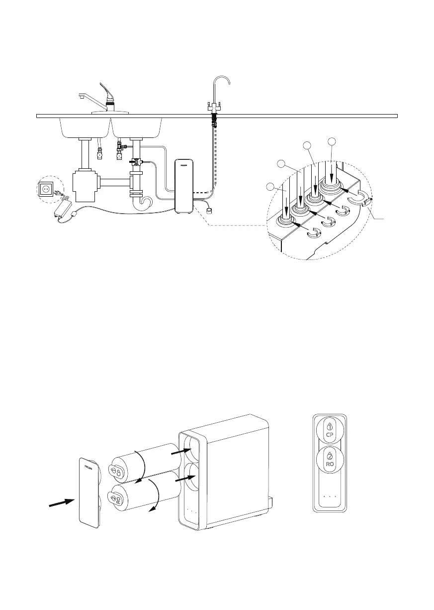 g. Снимите пластиковую пленку с фильтрующих картриджей. Вставьте фильтрующие картриджи