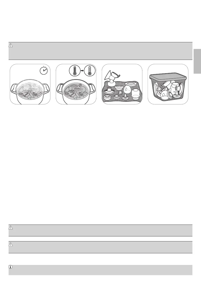 Upozornění: Při dezinfekci vařící vodou zajistěte, aby se lahev ani jiné části nedotýkaly strany hrnce.