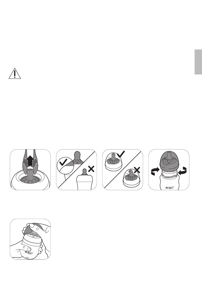 - Před každým použitím zkontrolujte lahev a krmicí dudlík a natáhněte dudlík ze všech stran, aby nemohlo dojít