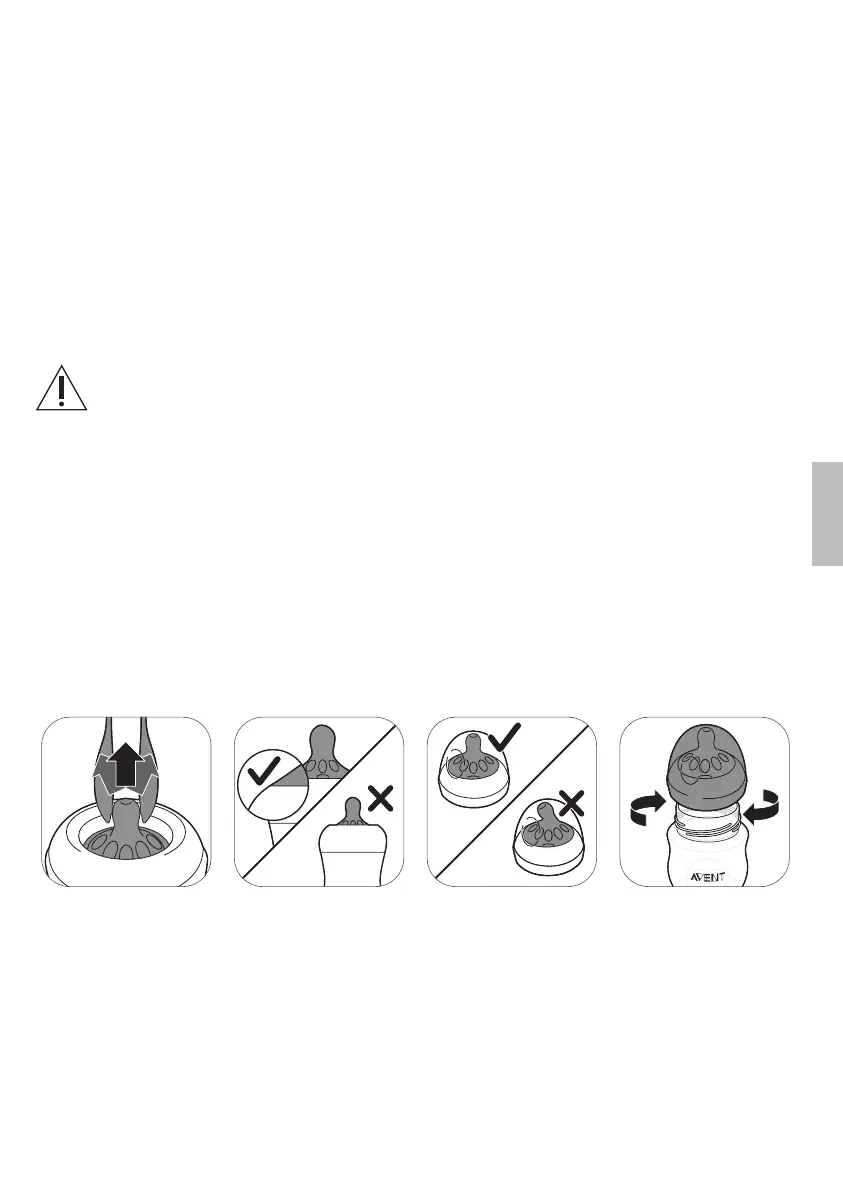 - Vericați biberonul și tetina înainte de ecare utilizare și trageți tetina în toate direcțiile pentru a evita pericolul de