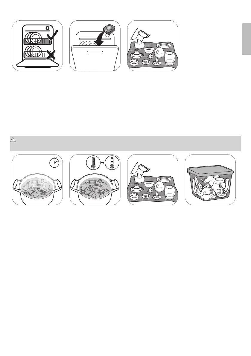 Caution: During disinfection with boiling water, prevent the bottle or other parts from touching the side of