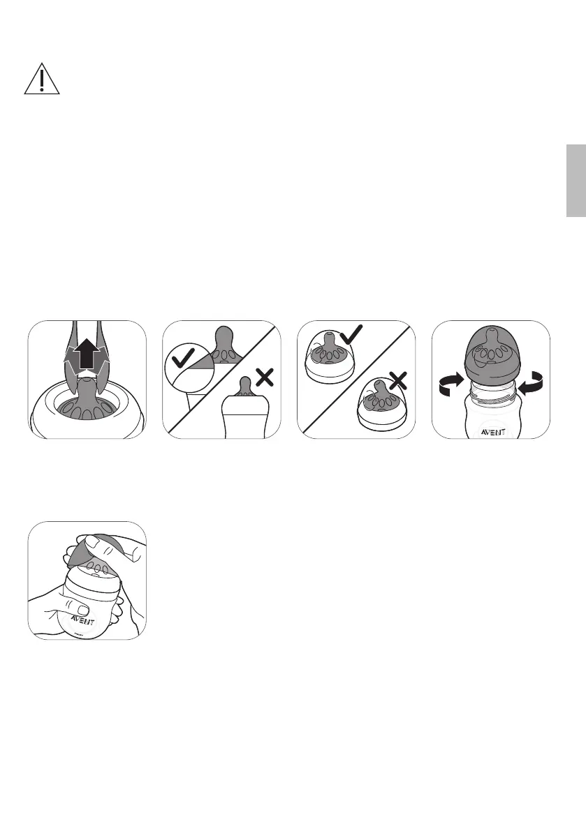- Examinez le biberon et la tétine avant chaque utilisation, et tirez cette dernière dans tous les sens pour éviter un