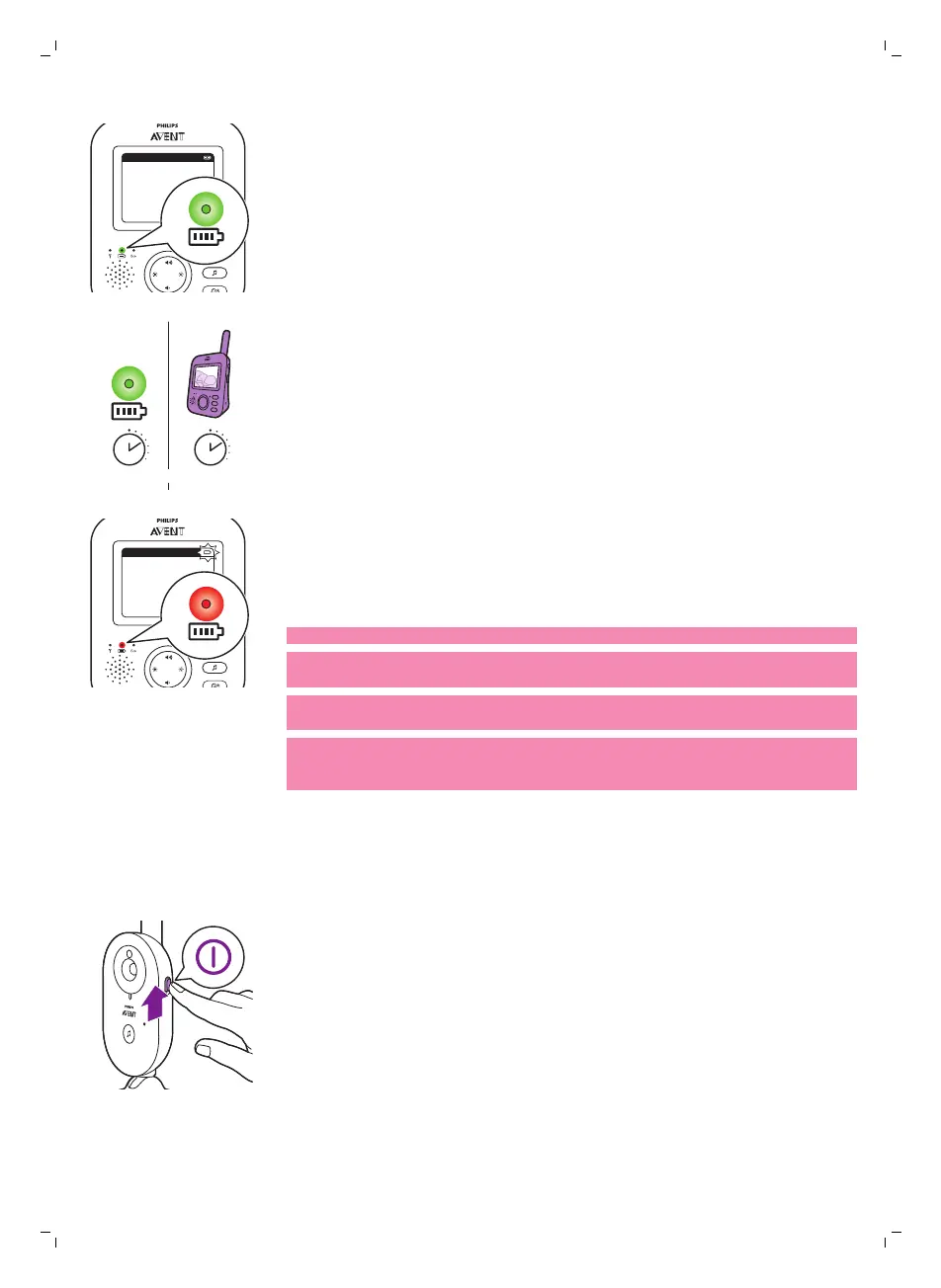 strøm, lyser batteristatusindikatorenrødt, og forældreenheden bipper.
